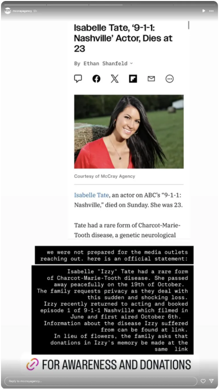 Isabelle Tate, the actress who made her debut in ABC’s “9-1-1: Nashville,” has died. Her shocking death on October 19, 2025, was confirmed by the McCray Agency, which represented the young star.